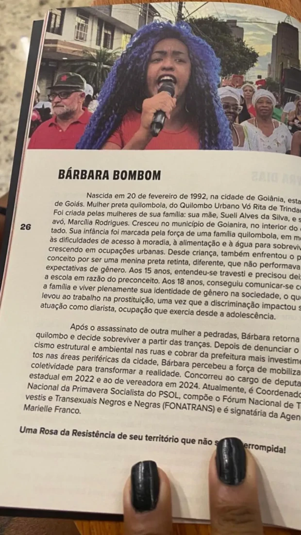 A goiana Bárbara Bombom é uma mulher trans de 33 anos. Afirma que é quilombola, da periferia, trancista e que já passou por tudo nessa vida – inclusive a prostituição. “Esse livro vem do projeto Respiro do Instituto Marielle Franco, que ajuda as mulheres candidatas negras não eleitas. A ajuda financeira é para poderem respirar e darem andamento nas suas vidas, especialmente, para não desistam da carreira política”, explica.