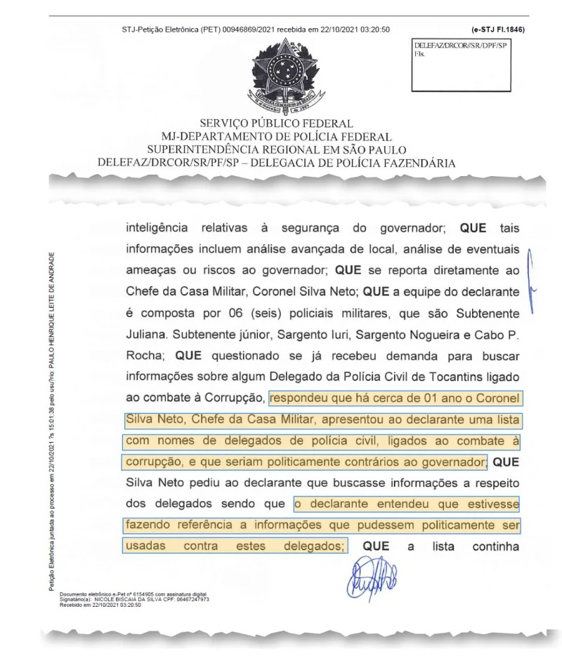 O depoimento do então chefe do Serviço de Inteligência da Camil traz revelações bombásticas de que o governador afastado instrumentou e aparelhou as instituições para perseguir adversários. Material divulgado pelo jornal do Tocantins, mostra como operava a a quadrilha do governador afastado. Consta no depoimento do chefe da inteligência do palácio Araguaia, minuciosas práticas criminosas que convergem para o nome do atual comandante geral, coronel Silva Neto, homem de confiança do ex-governador Carlesse, que dava ordens expressas para as tais práticas delituosas.