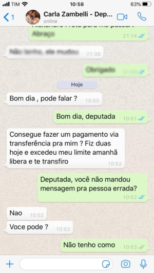 Deputada Carla Zambelli pede dinheiro por WhatsApp para editor do Opção. Celular foi clonado