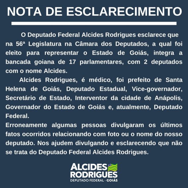 Jornais e redes sociais divulgaram a briga ocorrida na Unifan com o envolvimento do professor Alcides. Entretanto, alguns veículos se confundiram e usaram a foto de Alcides Rodrigues. Em nota encaminhada a imprensa, o parlamentar do Patriota pede ajuda para esclarecer a confusão. Veja a nota: