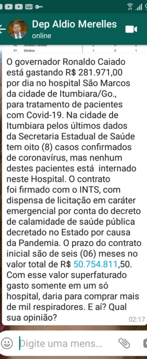 O deputado Claudio Meirelles (PTC) disparou mensagens de Fake News relacionadas a gastos com enfrentamento a Covid-19. O deputado enviou para seus contatos texto dizendo que o governo do Estado estaria gastando diariamente R$ 281.971,00 com Hospital e Maternidade São Marcos, em Itumbiara. Além disso seriam destinados pelo mais de R$ 50 milhões para serem gastos no hospital em 6 meses com pacientes infectados pelo coronavírus. O hospital está fechado e em nota o Governo do Estado afirma que nunca realizou os repasses e que repudia a criação da fake news.