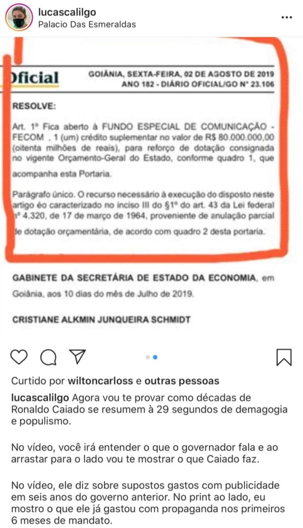O deputado Lucas Calil (PSD) usou suas redes sociais para criticar a destinação de recursos estaduais para um fundo que não existe mais. Em sua postagem ele cita uma verba de R$ 80 milhões para gastos com campanhas publicitárias, no entanto, o Fundo Especial de Comunicação foi extinto pelo no governo de Ronaldo Caiado (DEM).