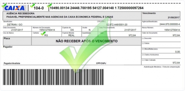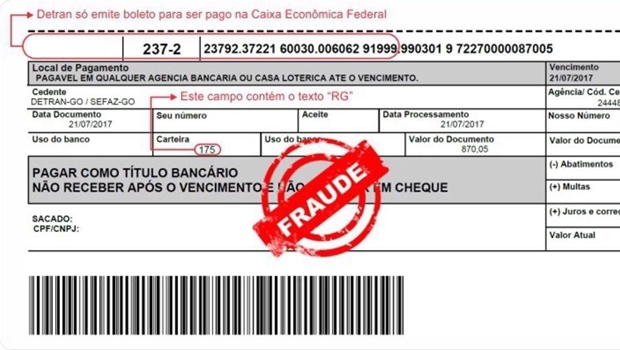 Importante ressaltar que apenas dois tipos de documentos são emitidos pelo Detran-GO: o Documento Único de Cobrança (DUA) e o Boleto, que é entregue na residência do proprietário ou pode ser retirado em uma unidade Vapt Vupt e no site. O banco também é um só: Caixa Econômica Federal. Caso o boleto seja de outra instituição financeira, é falso.