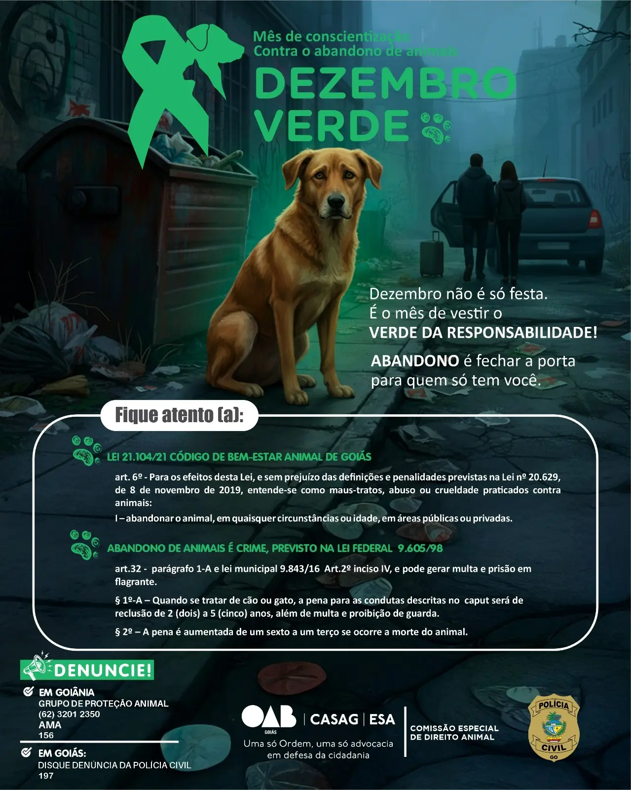 Sob o slogan “Dezembro não é só festa. É o mês de vestir o verde da responsabilidade”, a Campanha Dezembro Verde 2025 busca enfrentar um problema que se intensifica com as festas de fim de ano e as férias escolares: o abandono em massa de animais domésticos. Lançada nesta segunda-feira, 1º, pela Comissão Especial de Direito Animal (Ceda) da Ordem dos Advogados do Brasil – Seção Goiás (OAB-GO) em uma ação conjunta com o Grupo de Proteção Animal (GPA) da Polícia Civil e a Gerência de Projetos e Bem-Estar Animal (GPBEA) da Agência Municipal do Meio Ambiente (Amma), a campanha pretende, simultaneamente, educar a população e alertar para as consequências legais da prática.