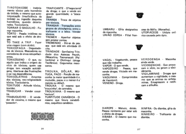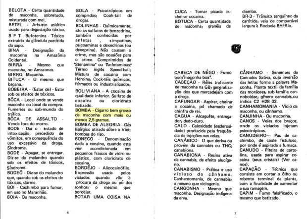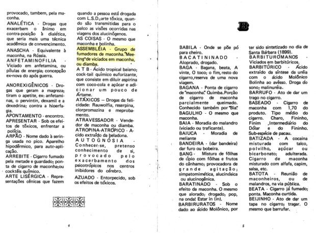 No texto, diversos termosfazem menção a um vocabulário político, sem relação direta com drogas. Os termos “Assembleia”, catalogado como “grupo de fumadores de maconha, meeting de viciados em maconha ou diamba”, ou “contestação”, que significaria, segundo o documento “protesto jovem, de conotação tóxica”.