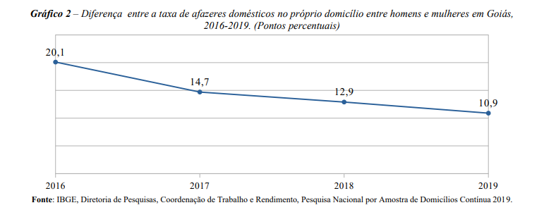 Analisando o tipo de afazer doméstico, em Goiás as mulheres realizam mais atividades que os homens em todos os grupos com exceção do grupo de reparos ou manutenção do domicílio, automóvel, eletrodomésticos e outros. As maiores diferenças são no grupo de limpeza ou manutenção de roupas e sapatos que 94,1% das mulheres realizaram em 2019 contra 59,6% dos homens; preparar ou servir alimentos, arrumar a mesa ou lavar a louça foi realizado por 96,1% das mulheres contra 63,8% dos homens.