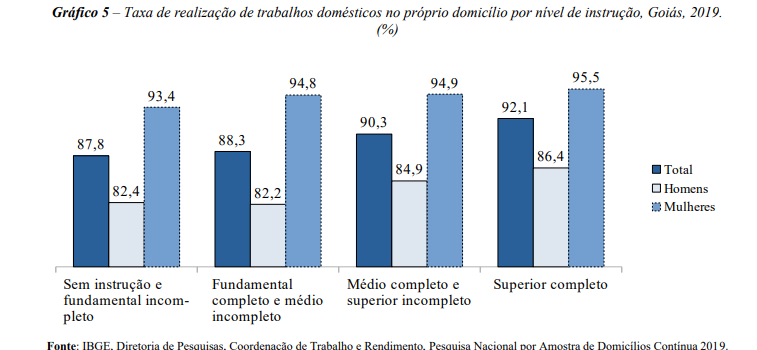 Tanto para os homens quanto para as mulheres há uma relação direta entre realização dos afazeres domésticos e o nível de instrução, sendo que a maior escolaridade aumenta a taxa de realização. Em Goiás, em 2019, 92,1% daqueles que possuíam superior completo realizavam afazeres doméstico enquanto a taxa daqueles que não possuíam instrução ou tinham fundamental incompleto era de 87,8%.