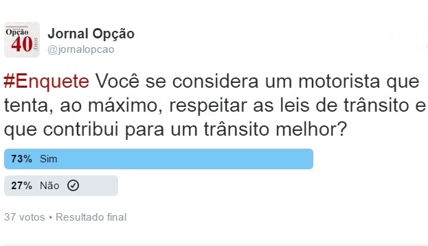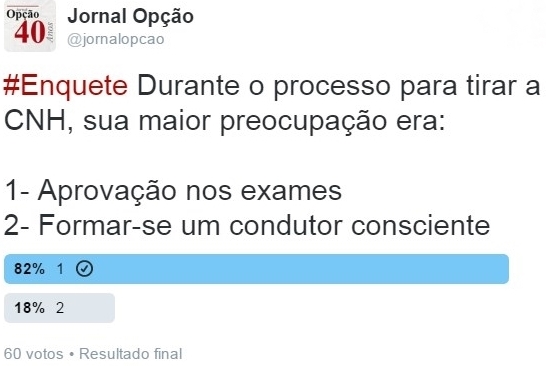 Laura e Taís não são as únicas que passaram pelo processo de formação do Detran alheias à realidade do trânsito. Em enquete feita pelo Jornal Opção no Twitter, 82% dos leitores consultados disseram que sua maior preocupação durante o curso de formação foi o resultado nos exames teórico e prático, enquanto apenas 18% afirmaram que se preocuparam mais em formar-se condutores conscientes. Curiosamente, na mesma publicação, mas em nova enquete, mais de 70% dos usuários disseram que se consideram motoristas que contribuem para a formação de um trânsito melhor.