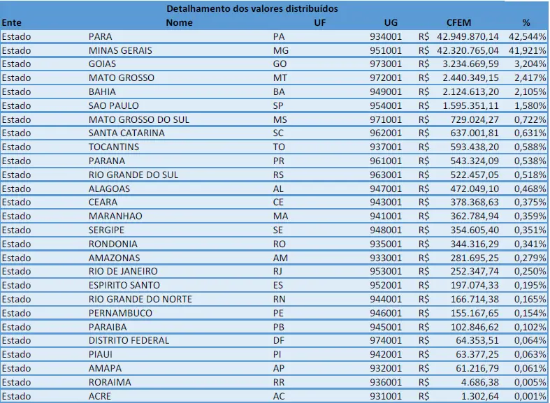Do total a ser distribuído, R$100.953.770,55 vai para os Estados e o Distrito Federal e R$403.815.074,64 para os Municípios. Os estados que mais receberam recursos da CFEM foram Pará (R$42,9 milhões), Minas Gerais (R$ 42,3 milhões) e Goiás (3,2 milhões). Esses três estados juntos somam 87,6% do que é produzido no Brasil.