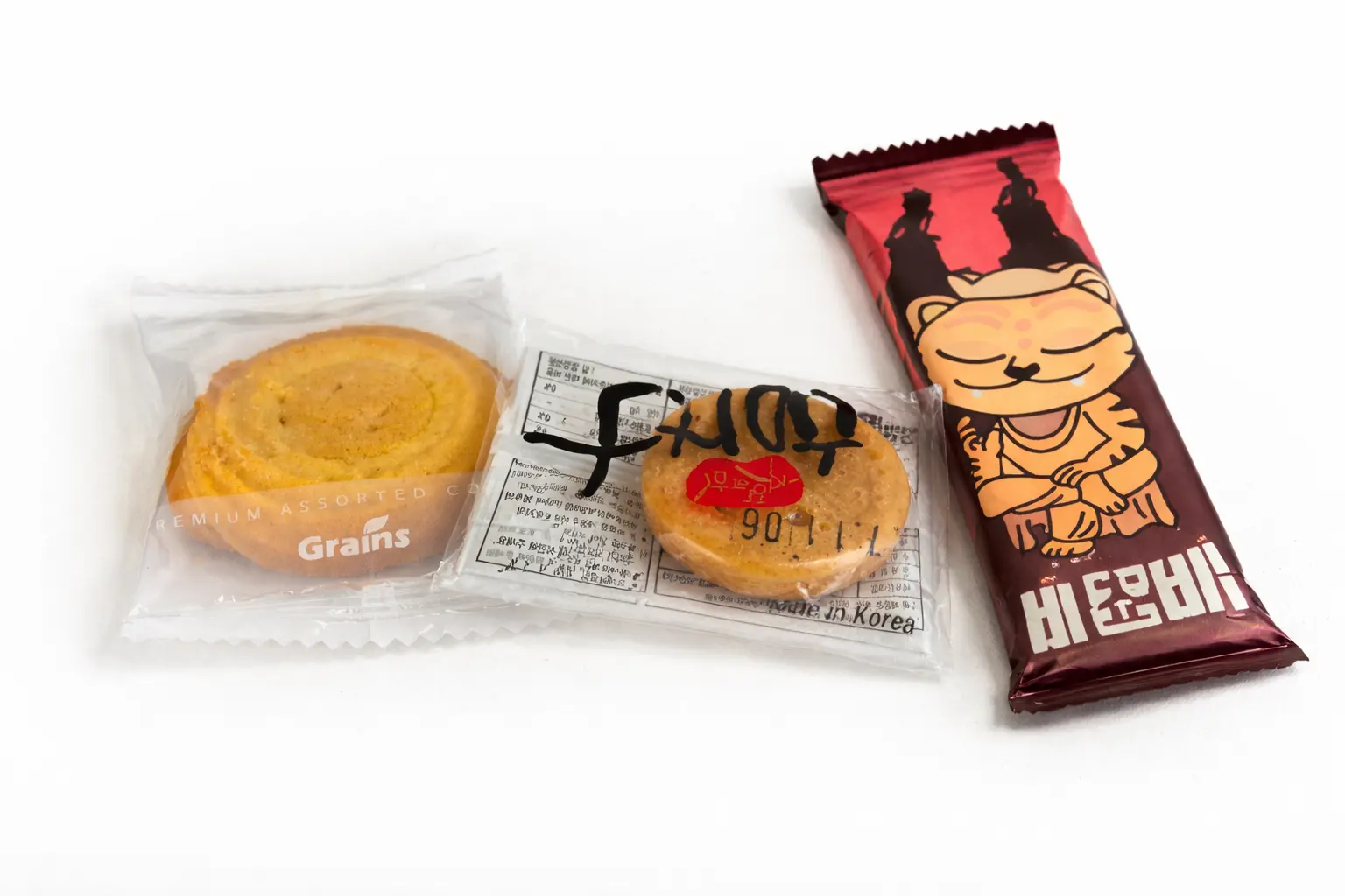 Entre os itens recebidos está um cookie da linha premium da marca Grains, que se diferencia pelo sabor levemente cítrico, com notas que remetem à laranja. O perfil aromático foge do padrão excessivamente doce comum em cookies ocidentais e dialoga com uma tendência da confeitaria sul-coreana de trabalhar sabores mais sutis e equilibrados.