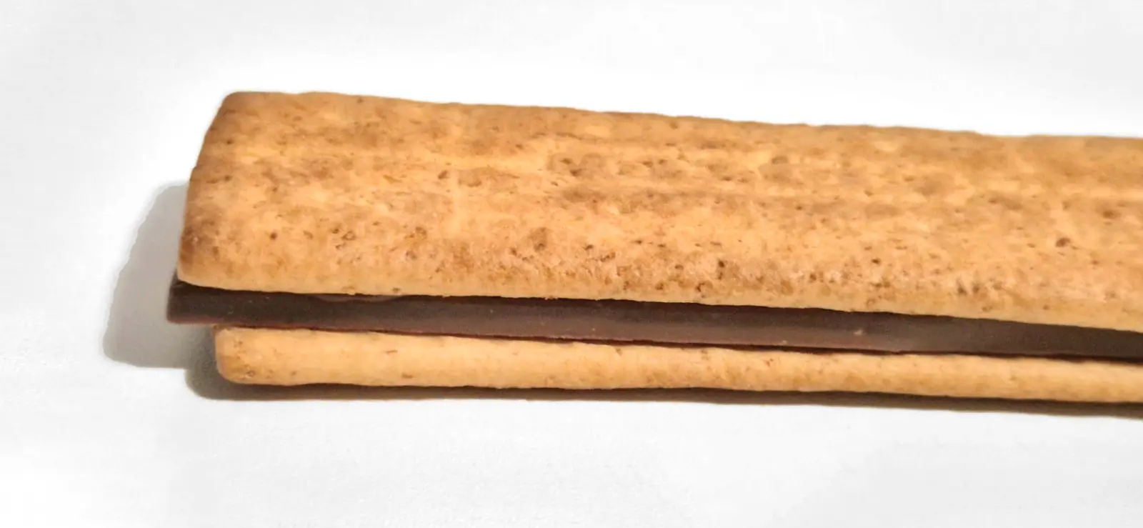 Outro item é um biscoito maior, em formato de barra, com ilustração de um personagem em estilo cartunesco — um gato — bastante típico das embalagens coreanas. O doce se assemelha a um wafer coberto com chocolate, de sabor familiar ao paladar brasileiro. A combinação lembra chocolates e biscoitos amplamente consumidos no Brasil.