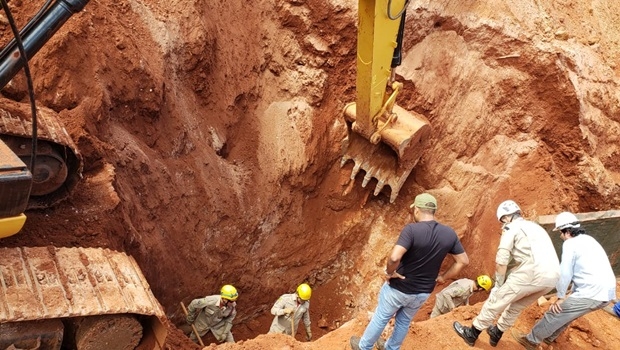 O Corpo de Bombeiros foi acionado no início da tarde desta quinta-feira (24/5) para socorrer dois homens que ficaram soterrados enquanto trabalhavam em uma obra da Saneago, próximo ao bairro Nossa Morada, na saída para Nova Veneza.