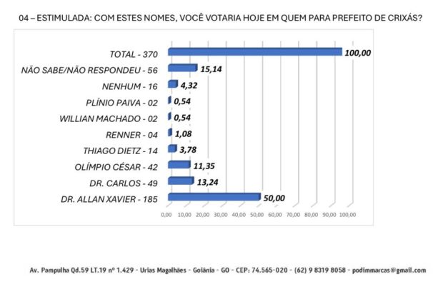 A pesquisa contou com a aplicação de 370 questionários, abrangendo todos os setores da cidade, incluindo o Distrito de Auriverde. Com uma margem de erro de 4,2 pontos percentuais para mais ou para menos, os resultados fornecem um panorama claro do atual cenário político em Crixás.