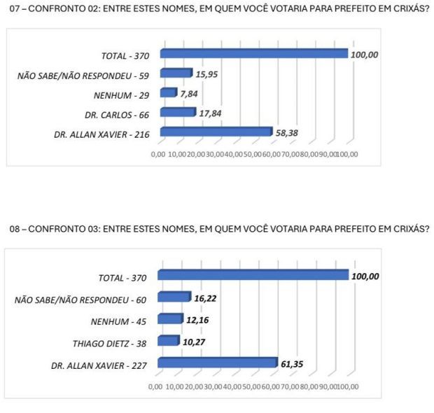 Em análise direta entre Dr. Allan e Dr. Carlos, Allan mantém uma vantagem significativa, com 58,38% da intenção de voto, enquanto Carlos registra 17,84%. A diferença é ainda mais pronunciada quando comparado a Thiago Dietz, onde Allan lidera com 61,35%, deixando Thiago com 10,27% dos votos.