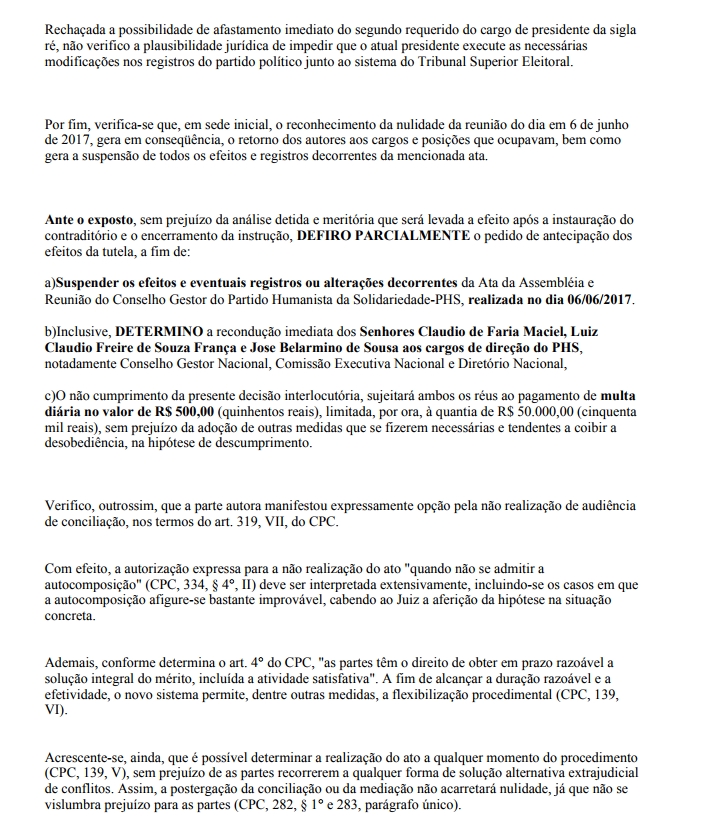 “A destituição dos membros de tal órgão não poderá ser realizada por ato unilateral de apenas um de seus Membros, que convocando reunião para a cidade diversa da sede nacional do Partido, sem indicar que poderia ser admitida a deliberação por membro único, nomeou outras pessoas para o Conselho, retirou todos os outros três membros e estabeleceu a composição dos órgãos partidários de forma anti-democrática”, diz a sentença.