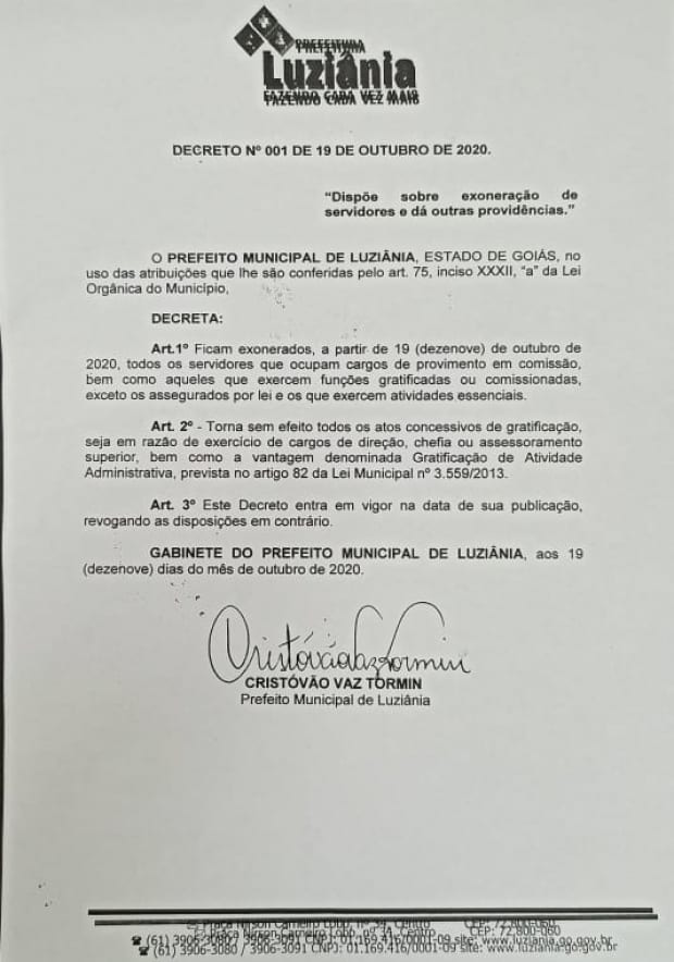 Com o final do prazo de 120 dias de afastamento determinado pela Justiça, o prefeito de Luziânia, Cristóvão Tormin (PSD), reassumiu a cadeira que havia sido ocupado pela sua vice, Edna Aparecida (Podemos), desde fevereiro deste ano. O prefeito afastado retomou o posto nesta segunda-feira, 19, e imediatamente publicou o decreto 001/2020 exonerando todos os servidores de cargos comissionados do município.