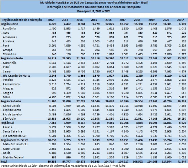 O Centro-Oeste foi a única região brasileira que registrou redução de internação de motociclistas: no primeiro semestre de 2021 foram 5.931 hospitalizações – 5% menos que o registrado no mesmo período de 2020
