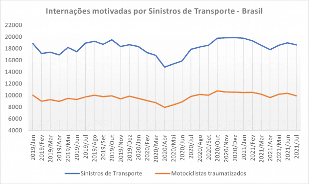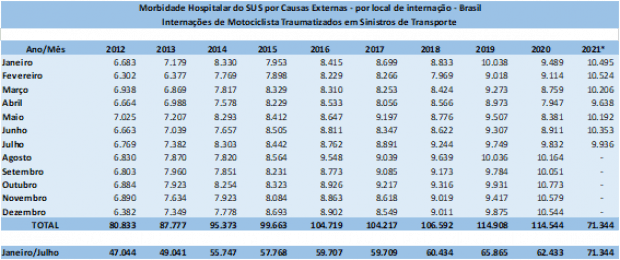 Considerado apenas o período de janeiro a julho, em 2021 o número de internações de motociclistas bateu recorde histórico, alcançando 71.344 casos graves e que exigiram a hospitalização do motociclista. Além do alto custo para a saúde dos indivíduos e suas famílias, as tragédias também custaram aos cofres públicos quase R$ 108 milhões neste ano. No ano passado, o SUS desembolsou cerca de R$ 171 milhões para tratar motociclistas traumatizados.
