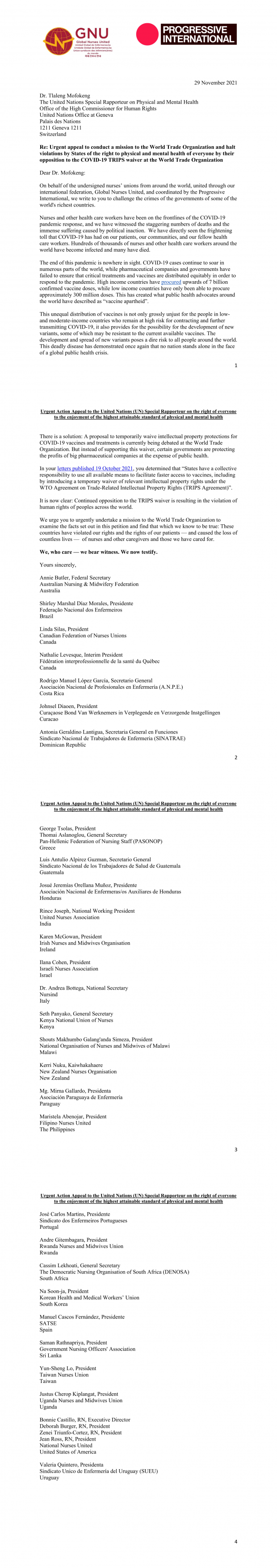A carta foi enviada diretamente à relatora especial da ONU para direitos à saúde, Tlaleng Mofokeng. A carta também foi assinada pela Federação Nacional dos Enfermeiros (FNE), do Brasil, que representa mais de 632 profissionais. Ao todo, cerca de 2,5 milhões de trabalhadores da saúde em todo o mundo são representados pela coalização.