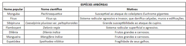 No projeto aprovado e sancionado, está prevista somente a substituição das mongubas e dos ficus. “Devido à sua fragilidade, as mongubas, sendo uma espécie típica da Mata Atlântica em áreas úmidas, têm dificuldade em enraizar adequadamente. Isso aumenta significativamente o risco de queda”, explica a bióloga Wanessa Castro.