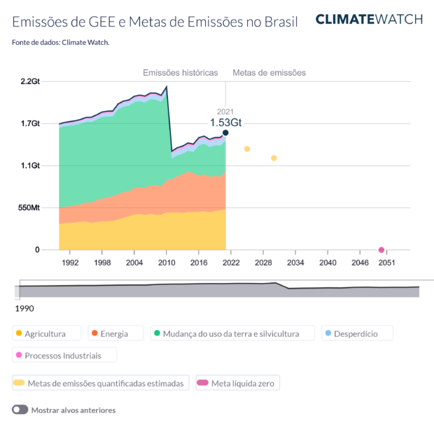 Dados da plataforma aberta Climate Watch (observatório do clima, em tradução livre), apontam que em 2021, o Brasil emitiu 1469,64 milhões de toneladas de CO2 equivalente representando 3,09% das emissões globais. O Brasil, tem como compromisso, reduzir suas emissões em 48,4% até 2025, em relação aos níveis de 2005, e em 53,1% em relação aos níveis de 2005 até 2030.
