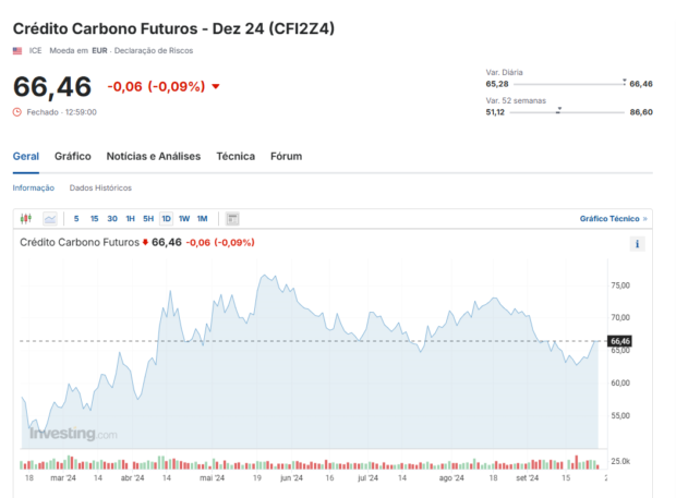A cotação do crédito de carbono hoje no mercado americano é de US$ 66,46, o que equivalente a cerca de R$ 361.