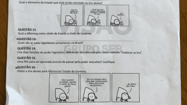 No exercício, o professor Osvaldo Machado pediu que os alunos respondessem “qual elemento do Estado que está sendo retratado na tira abaixo?”, aponta a questão 11 do exame. A imagem, produzida pelo artista André Dahmer, mostra um personagem fazendo comentários durante a leitura de um jornal: “Mais um assalto em São Paulo. Ainda bem que temos a polícia para combater a violência em prol…da barbárie”, diz a tirinha. “A resposta era que o Estado é o único que pode usar a força. É só isso”, explicou Machado. A questão compunha lista de exercícios destinada a alunos de recuperação do Colégio Visão.
