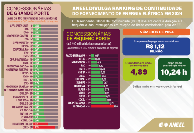 A distribuidora registrou melhora nos seus indicadores em relação ao ano anterior: o DGC foi de 1,66 em 2023 para 1,19 em 2024 (quanto menor o índice, melhor o desempenho). A queda no posicionamento nacional revela que outras concessionárias avançaram mais no mesmo período. O ranking compara os resultados reais de cada distribuidora com as metas individualizadas estabelecidas pela ANEEL, que levam em conta as características específicas de cada área de concessão.
