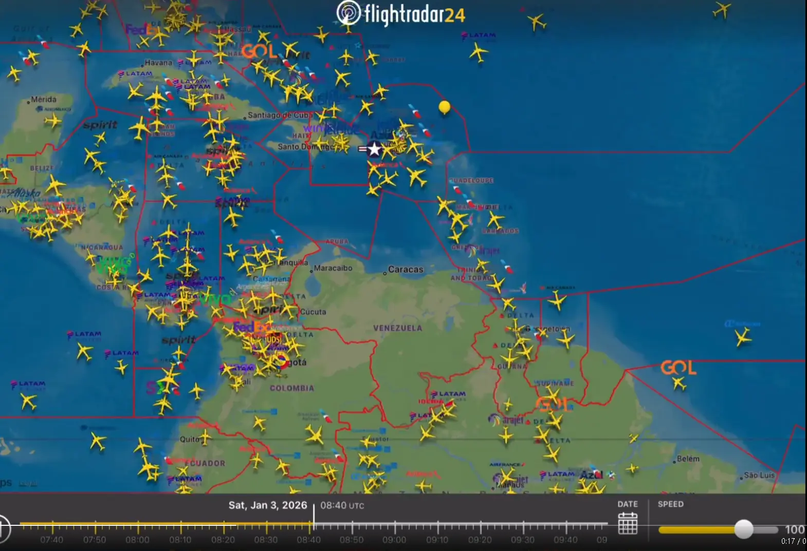 Dados do serviço de monitoramento de voos FlightRadar24 indicam que o espaço aéreo da Venezuela permaneceu praticamente vazio durante a madrugada e ao longo deste sábado, 3, em contraste com a intensa circulação registrada em países vizinhos do Caribe e da América do Sul.