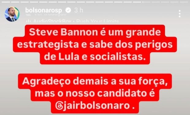 O ex-assessor de Donald Trump, Steve Bannon, afirmou que o deputado federal Eduardo Bolsonaro (PL-SP) – o 03 – será presidente do Brasil em um “futuro não tão distante”. Conhecido pelo trabalho como estrategista do novo presidente dos Estados Unidos, Bannon é um dos mentores dos bolsonaristas.
