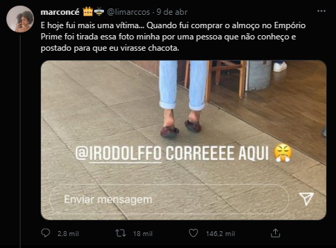 Foi no trabalho, logo após seu intervalo de almoço, quando o estudante de Publicidade e Propaganda, Marcos Paulo Goes Lima, foi alertado e questionado por seus colegas sobre sua aparição nos stories da conta do Instagram de uma mulher. Na foto divulgada, em que a pessoa escreveu a legenda “Rodolffo, corre aqui”, o jovem estava de costas, na entrada de um supermercado. A publicação foi realizada na tarde as última sexta-feira, 9.