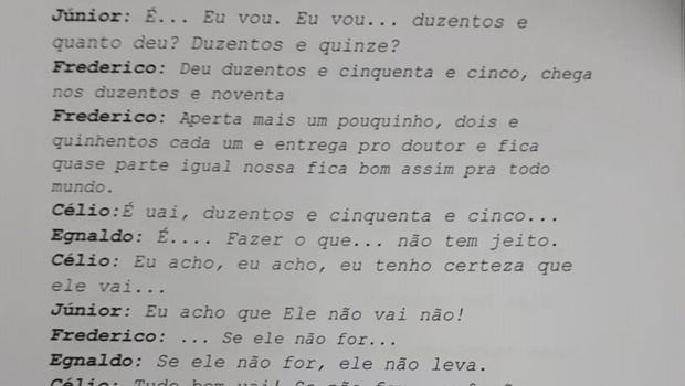 No primeiro áudio, o vereador Frederico Antonio Monteiro pede R$ 290 mil a José Júnior. Estavam presentes no encontro o vereador Célio Ferreira Nunes, Egnaldo José e Pedro da Silva.