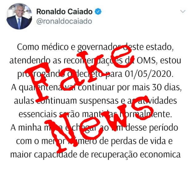 O governador Ronaldo Caiado (DEM) novamente é alvo de fake news. Desta vez, circula nas redes sociais um print falso de uma declaração atribuída ao governador em que ele prorroga a quarentena em Goiás até o dia 1º de maio.