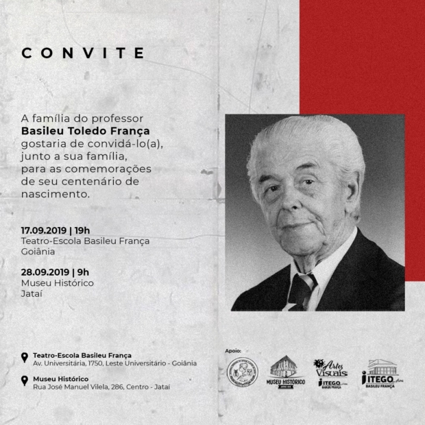 A memória do historiador, jornalista, escritor jataiense e entusiasta da cultura Basileu Toledo França será lembrada em solenidade hoje às 19 horas. O evento celebra a data que marca os 100 anos de nascimento do filho de Jataí que dá nome ao Teatro-Escola Basileu França, em Goiânia, que será palco da ocasião festiva.