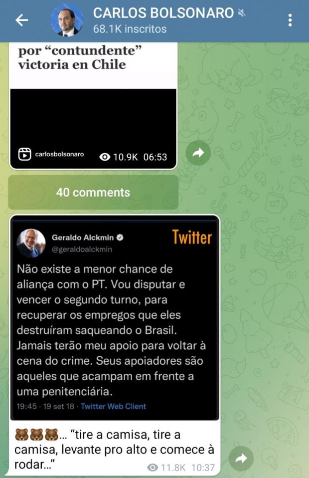 Carlos Bolsonaro (Republicanos-RJ), por exemplo, postou um vídeo de 2018 onde Alckmin aparece discursando contra Lula, e afirma que ele “quebrou o Brasil” e que volta dele ao poder seria uma “volta à cena do crime”. Na descrição do vídeo ele ironizou: “Lula e Alckmin, um par perfeito para as eleições de 2022”. O mesmo vídeo foi postado por Flávio Bolsonaro (PL-RJ). Outros canais bolsonaristas no Telegram, como o do blogueiro Allan dos Santos e da deputada federal Bia Kicis (PSL-DF) também resgataram os antigos ataques de Alckmin a Lula para criticar a atual aproximação entre os dois.