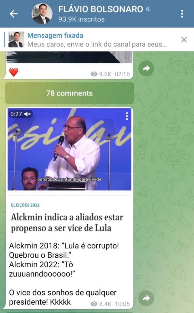 Também utilizando a lista de transmissão do Telegram, novo refugio da direita, Flávio Bolsonaro (PL-RJ) ironiza comportamento do ex-governador em 2018 com possível aliança para 2022. Em descrição escreve: “O vice dos sonhos de qualquer presidente!”.