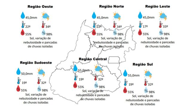 Veja abaixo mapa com previsão para cada região de Goiás: