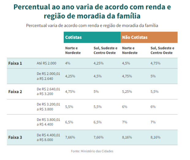 As taxas de financiamento variam de acordo com a renda da família e a região. Elas variam de 4% ao ano a 8,16% ao ano, sendo inferiores às taxas praticadas por outras linhas de crédito do mercado. O prazo máximo para o financiamento é de 35 anos.