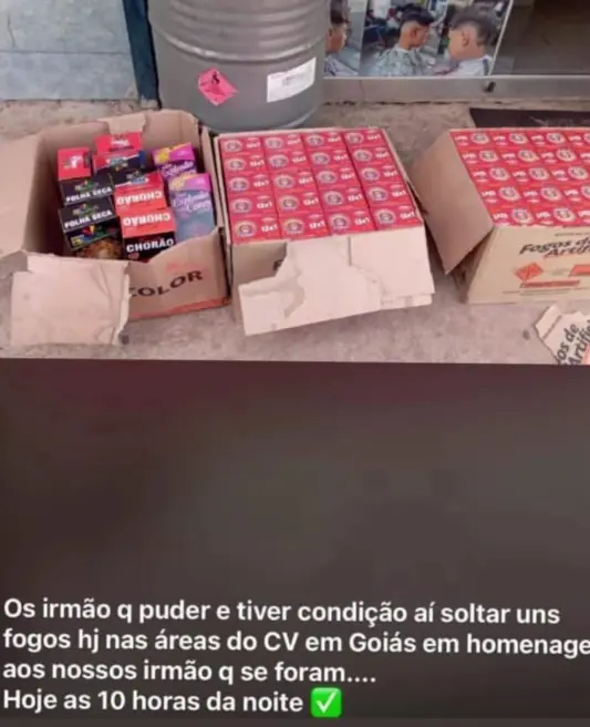 Mensagens que circulam em grupos de WhatsApp apontam que o foguetório registrado na noite de terça-feira, 4, em diferentes pontos da região metropolitana de Goiânia teria sido coordenado pelo Comando Vermelho (CV). O ato, segundo relatos, seria uma homenagem a seis foragidos de Goiás mortos na megaoperação policial no Rio de Janeiro na semana passada. Polícia apura o ocorrido.