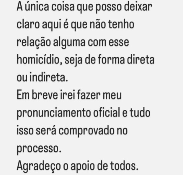 A influencer, que foi presa suspeita de ajudar o namorado em um assassinato em março de 2022, disse na postagem que “não possui relação nenhuma com esse homicídio, seja de forma direta ou indireta”. Além de se dizer inocente, a influenciadora reforçou que “tudo será comprovado no processo”.