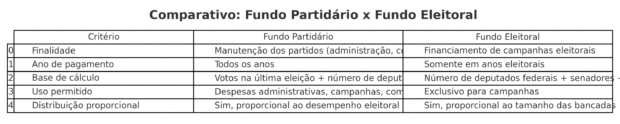 | Usado para manutenção dos partidos (custos administrativos, formação de quadros, comunicação etc.). | Destinado exclusivamente às campanhas eleitorais (durante o ano eleitoral). |