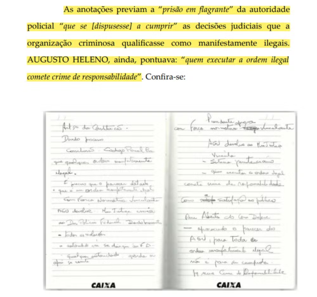 Em anotações do ex-ministro Chefe do Gabinete de Segurança Institucional (GSI), general Augusto Heleno, teria a indicação de prender qualquer policial federal que cumprisse ordens judiciais. A orientação estava na estrutura da Abin paralela e em documentos de Heleno, que havia um plano para utilizar a Advocacia-Geral da União (AGU) como respaldo jurídico para que a PF não cumprisse ordens judiciais.