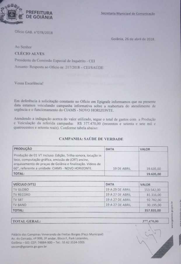 Segundo o documento, a gestão do prefeito Iris Rezende (MDB) gastou quase R$ 20 mil apenas para a produção do vídeo de um minuto gravado na unidade. O restante do dinheiro foi gasto para comprar o tempo de TV nas emissoras locais.