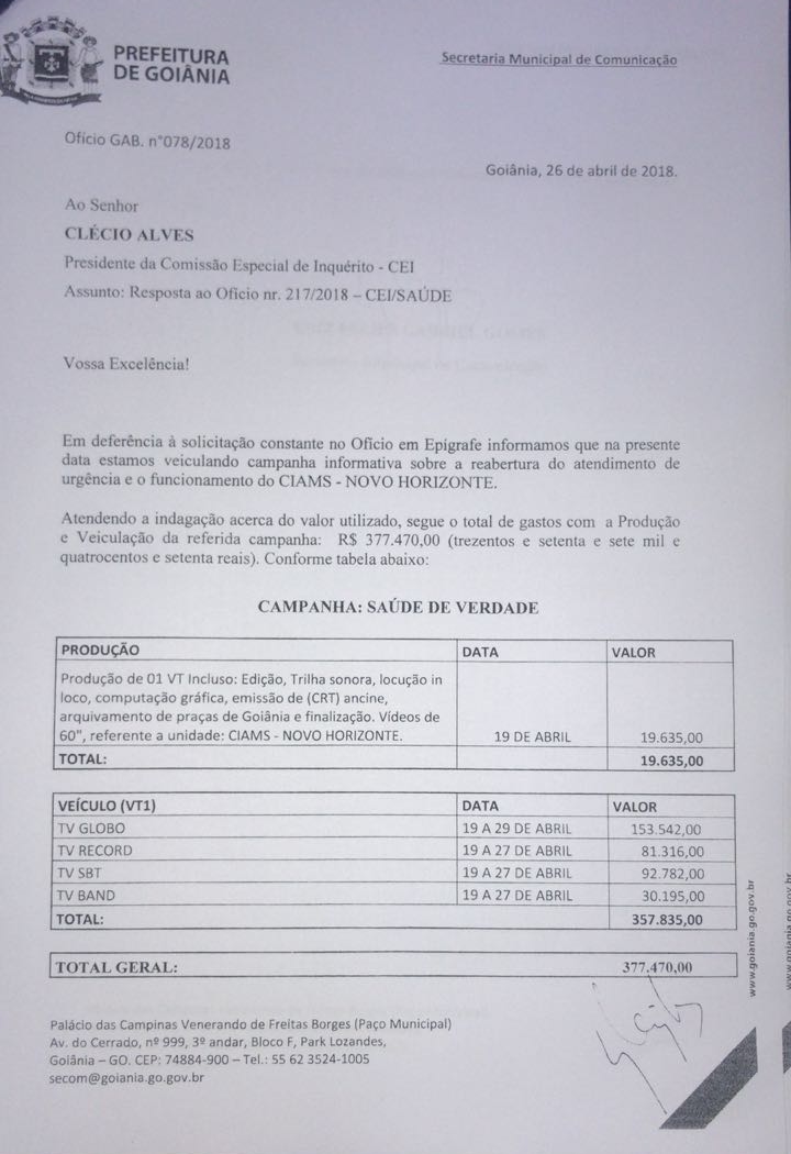 A informação obtida pelo Jornal Opção foi prestada em resposta à oficio da Comissão Especial de Inquérito (CEI) da Saúde que, a partir de requerimento da vereadora Dra. Cristina Lopes (PSDB), solicitou planilha com o valor gasto com publicidade gravada no Ciams Novo Horizonte.