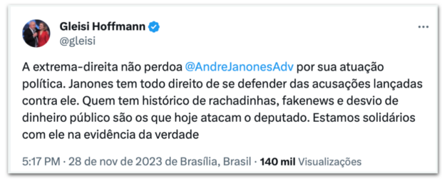 “A extrema-direita não perdoa Janones por sua atuação política. Quem tem histórico de rachadinhas, fake news e desvio de dinheiro público são os que hoje atacam o deputado. Estamos solidários com ele na evidência da verdade”, postou a presidente do PT pelo antigo Twitter, o X.