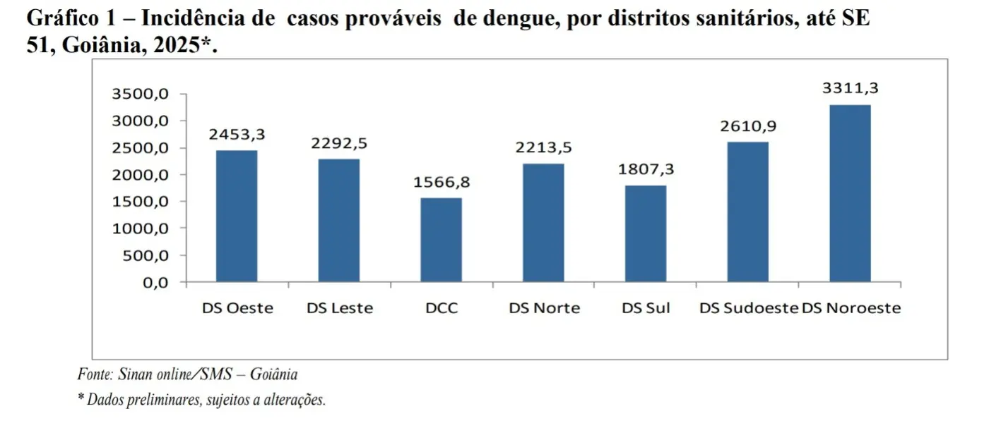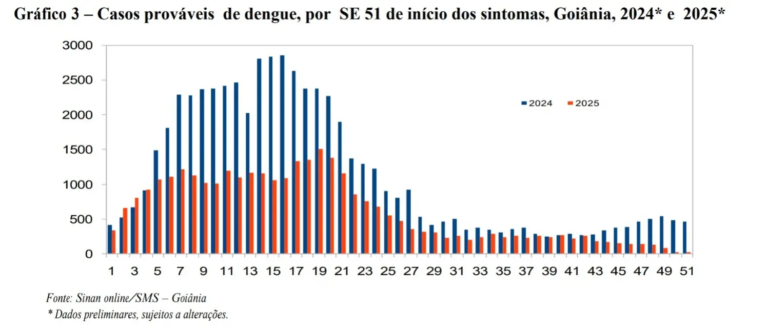 Em 2025, conforme o Boletim Epidemiológico Arboviroses, Goiânia registrou 27.871 casos de dengue, sendo 75 mais graves e 38 mortes causados pela doença. Quantitativo é 21,9% menor do que o apresentado no mesmo período do ano passado, quando a capital contabilizou 48.619 casos de dengue e 82 pessoas perderam a vida por causa da doença.