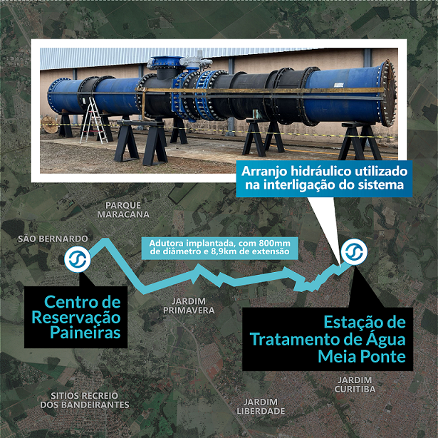 O trabalho deste fim de semana consiste em realizar a interligação de uma nova adutora, de 8,9 km de extensão, ao sistema atualmente em operação. A obra vai permitir que a água do Sistema Meia Ponte chegue até o Centro de Reservação Paineiras, atendendo cerca de 54 mil habitantes nos municípios de Goiânia, Trindade e Goianira.