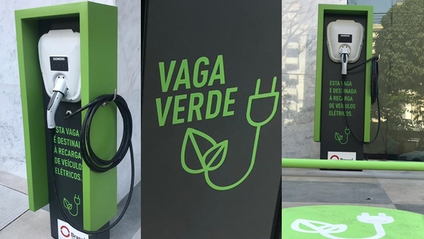 Quem possuir um carro elétrico e quiser carregar na vaga verde disponibilizada no local precisa apenas pedir liberação do carregador (que é universal) para a recepcionista.