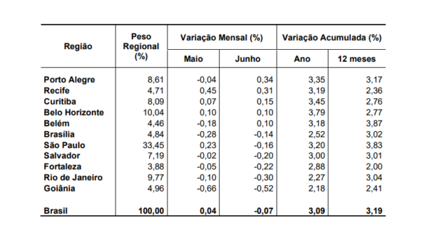No país, o índice apresentou queda de 0,07%. O IPCA-15 acumula alta de 3,09% no ano e 3,19% em 12 meses. O resultado segue o efeito do indicador em Goiânia, com o grupo de habitação e alimentos e bebidas puxando o resultado.