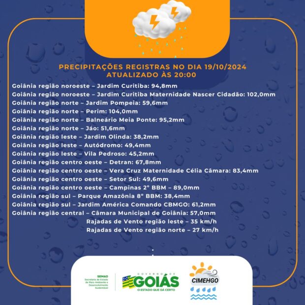 As precipitações registradas em Goiânia na última sexta-feira, 19, apresentaram variações significativas em diferentes regiões da cidade, segundo dados divulgados pelo Centro de Informações Meteorológicas de Goiás (Cimehgo). As medições mostraram que algumas áreas enfrentaram chuvas intensas, com volumes que ultrapassaram a marca de 100 mm.